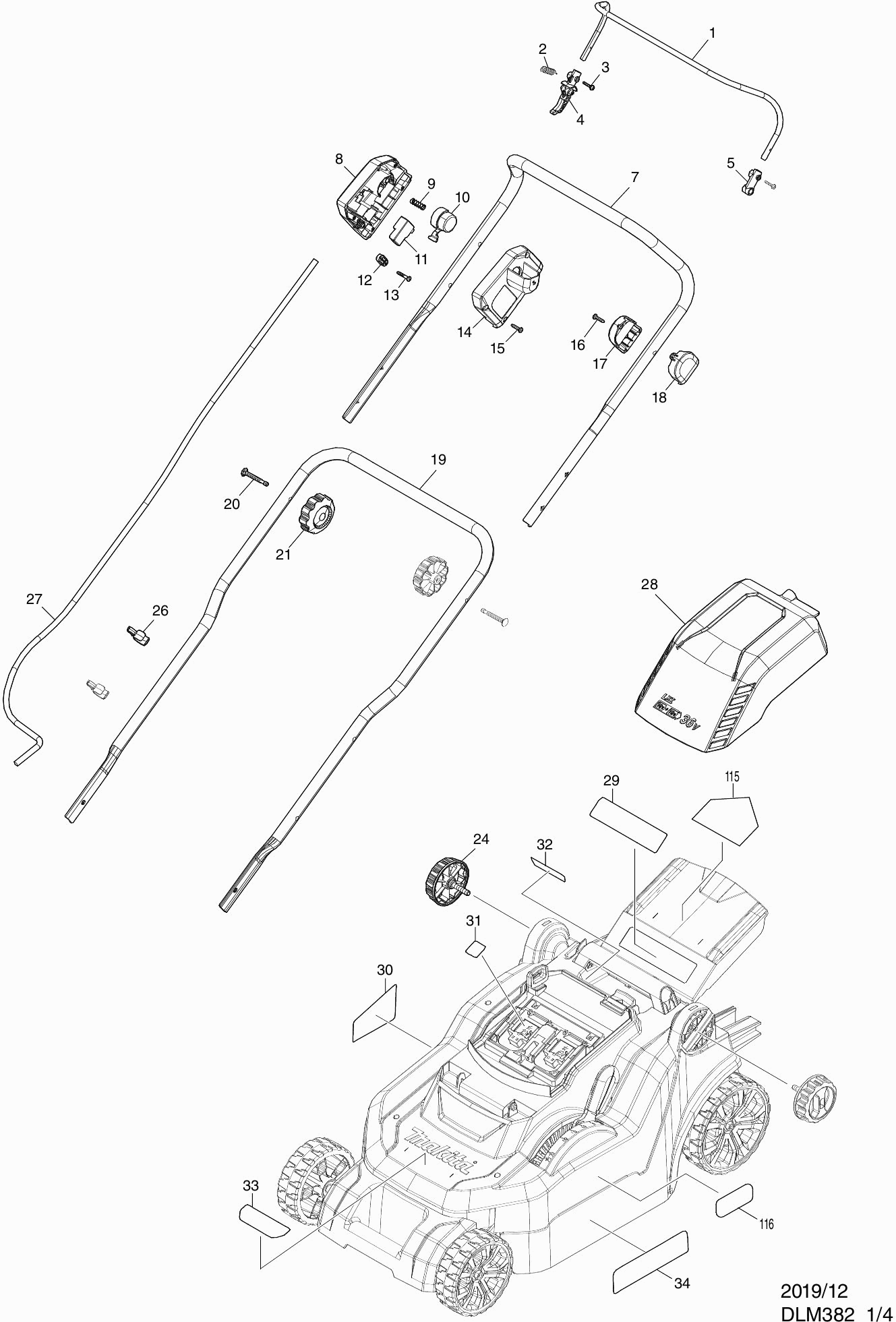 Here you will find all available parts and drawings of the 'Makita DLM382'. From here you can order all desired parts directly. Many parts must be ordered from the manufacturer, depending on the brand, this takes one to four weeks. All the information we have is on our website, we cannot advise you on what you need, for that you will need to return the machine for repair. Please note the following when ordering: