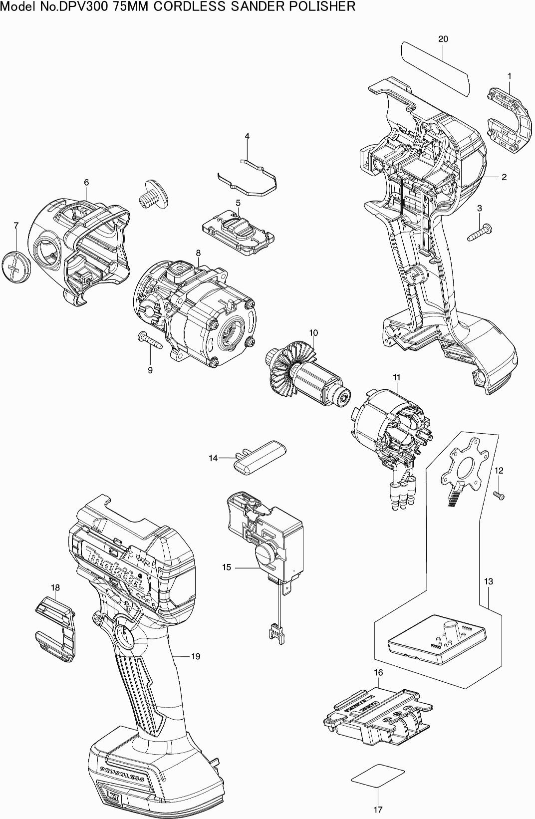 Here you will find all available parts and drawings of the 'Makita DPV300'. From here you can order all desired parts directly. Many parts must be ordered from the manufacturer, depending on the brand, this takes one to four weeks. All the information we have is on our website, we cannot advise you on what you need, for that you will need to return the machine for repair. Please note the following when ordering: