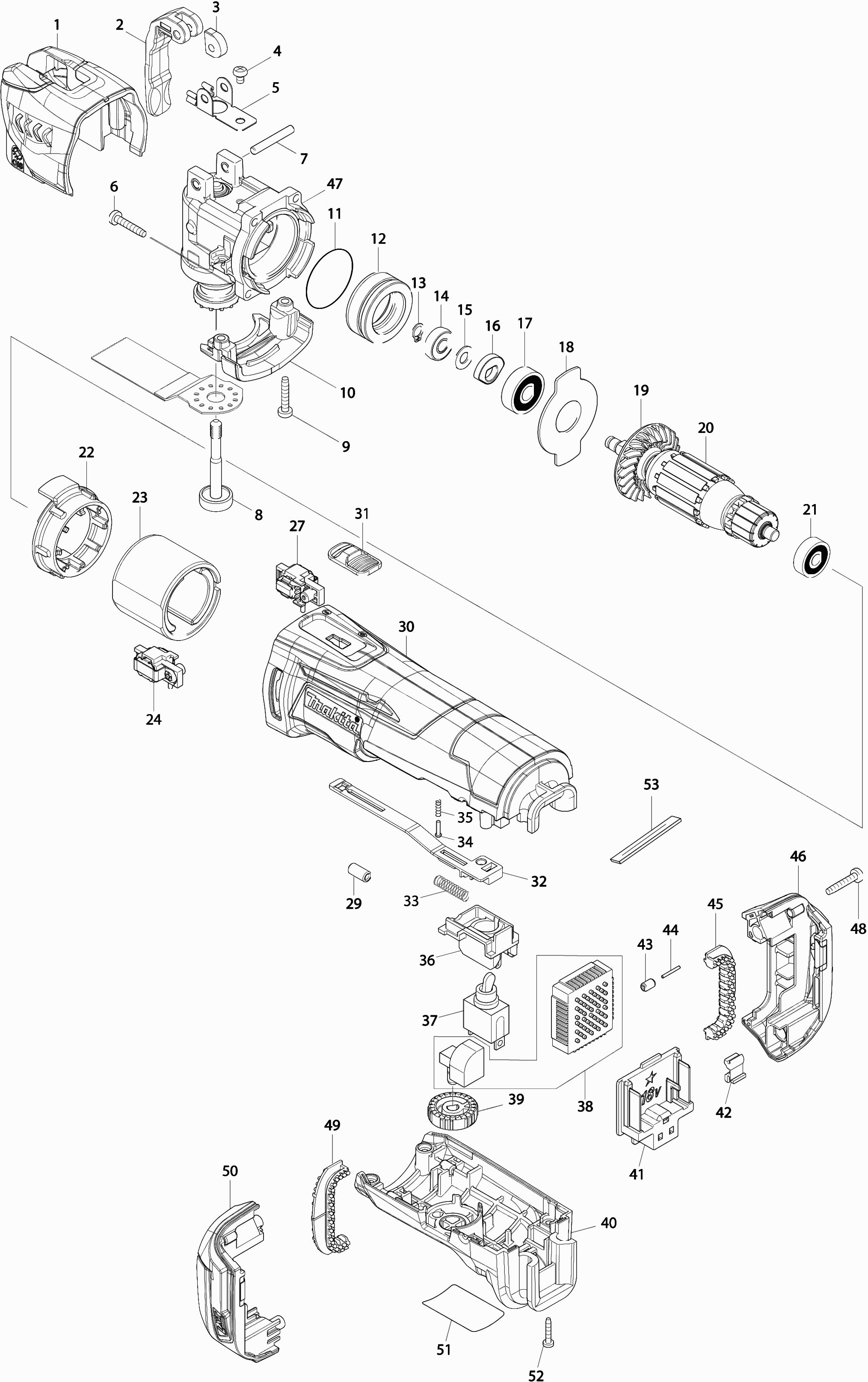 Here you will find all available parts and drawings of the 'Makita DTM51'. From here you can order all desired parts directly. Many parts must be ordered from the manufacturer, depending on the brand, this takes one to four weeks. All the information we have is on our website, we cannot advise you on what you need, for that you will need to return the machine for repair. Please note the following when ordering: