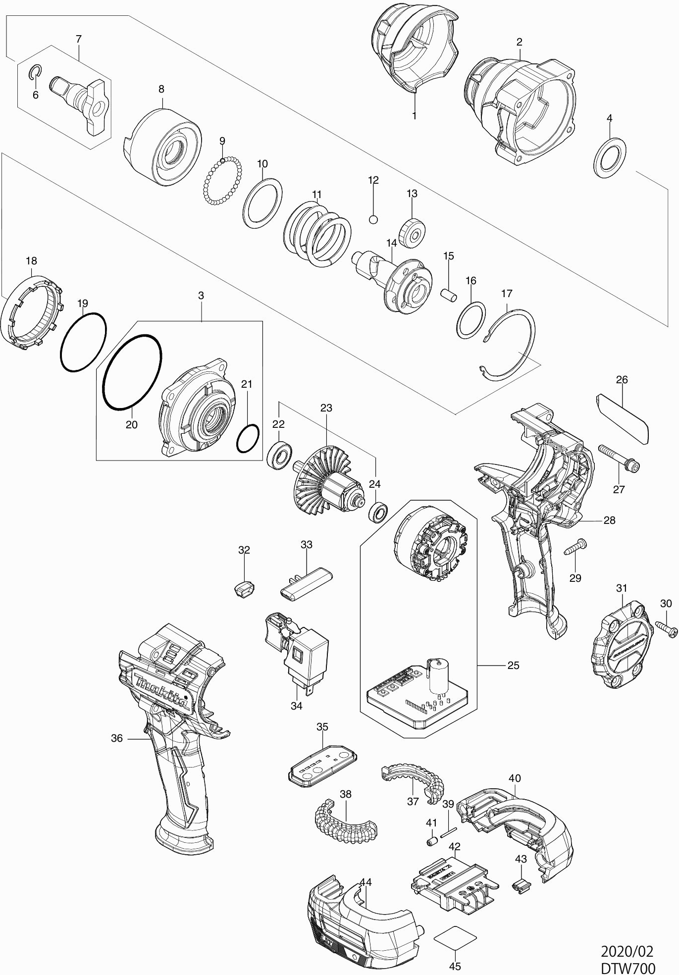 Here you will find all available parts and drawings of the 'Makita DTW700'. From here you can order all desired parts directly. Many parts must be ordered from the manufacturer, depending on the brand, this takes one to four weeks. All the information we have is on our website, we cannot advise you on what you need, for that you will need to return the machine for repair. Please note the following when ordering: