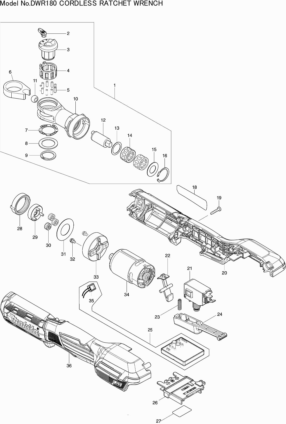 Technical drawing of model Makita DWR180
