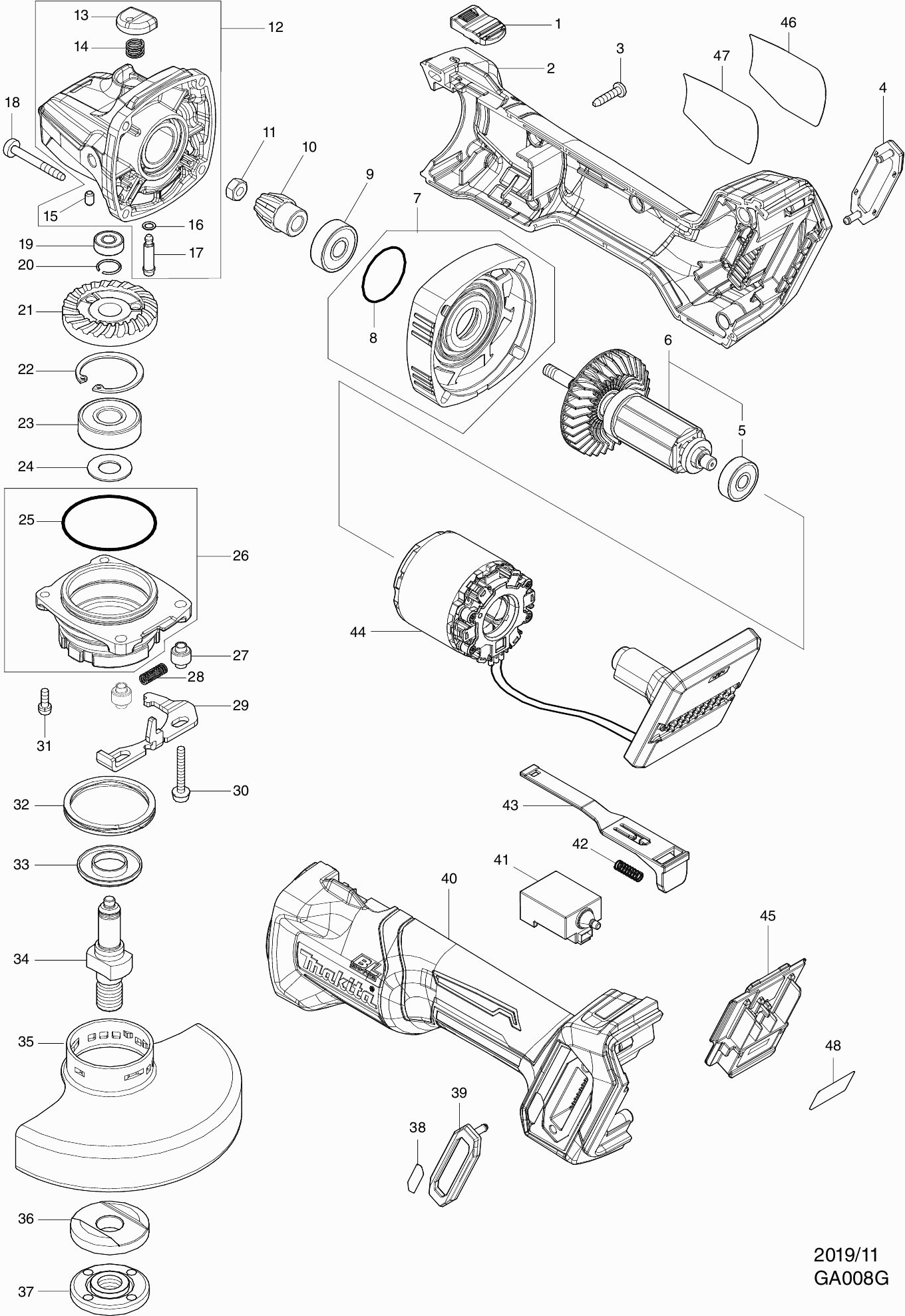 Here you will find all available parts and drawings of the 'Makita GA008G'. From here you can order all desired parts directly. Many parts must be ordered from the manufacturer, depending on the brand, this takes one to four weeks. All the information we have is on our website, we cannot advise you on what you need, for that you will need to return the machine for repair. Please note the following when ordering: