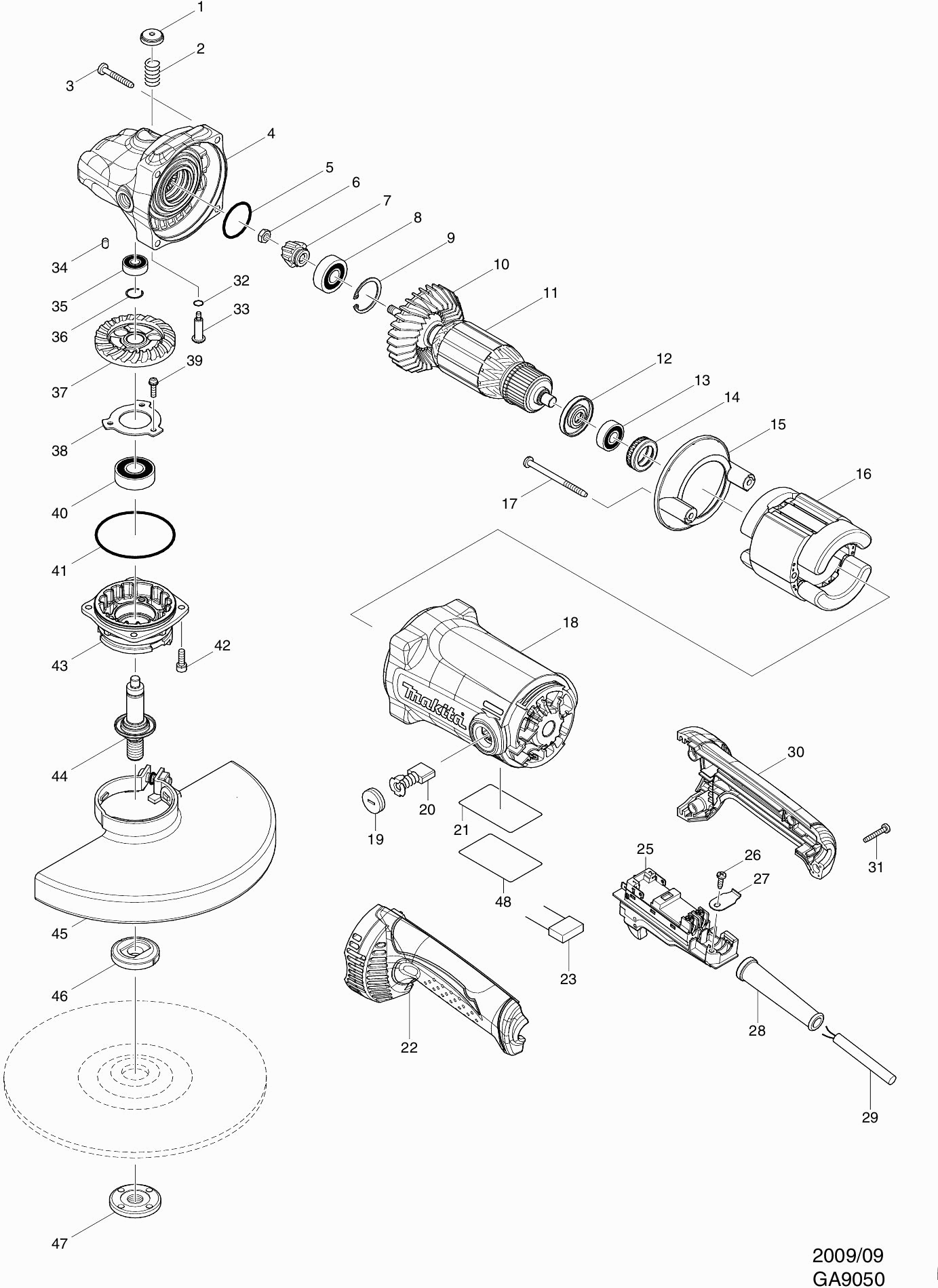 Here you will find all available parts and drawings of the 'Makita GA9050'. From here you can order all desired parts directly. Many parts must be ordered from the manufacturer, depending on the brand, this takes one to four weeks. All the information we have is on our website, we cannot advise you on what you need, for that you will need to return the machine for repair. Please note the following when ordering: