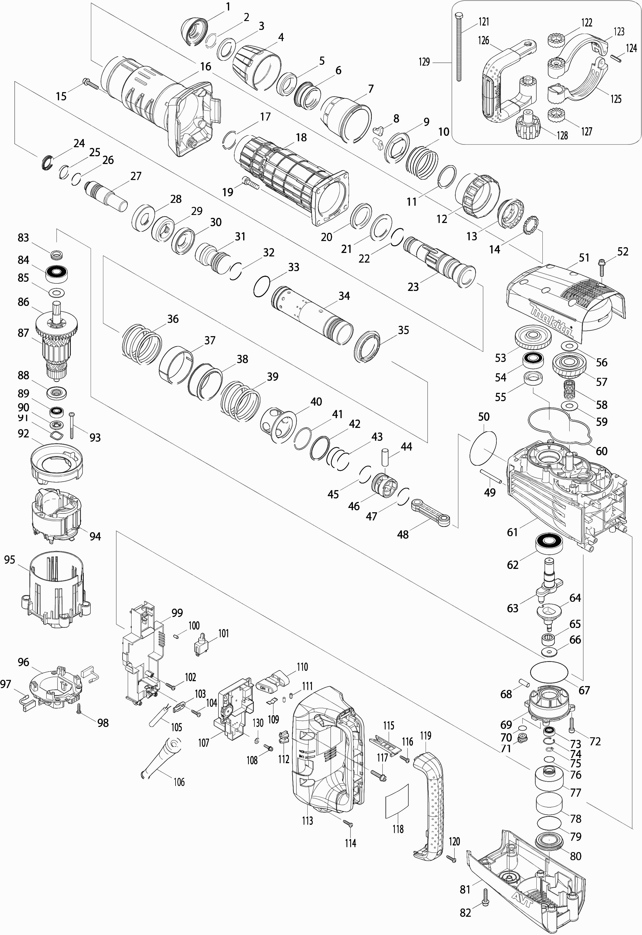 Here you will find all available parts and drawings of the 'Makita HM1214C'. From here you can order all desired parts directly. Many parts must be ordered from the manufacturer, depending on the brand, this takes one to four weeks. All the information we have is on our website, we cannot advise you on what you need, for that you will need to return the machine for repair. Please note the following when ordering: