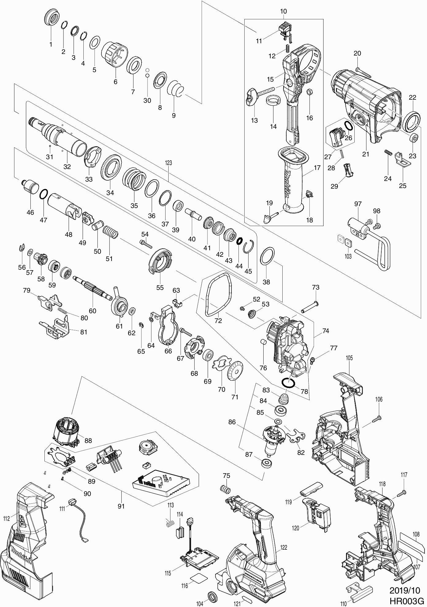 Here you will find all available parts and drawings of the 'Makita HR003G'. From here you can order all desired parts directly. Many parts must be ordered from the manufacturer, depending on the brand, this takes one to four weeks. All the information we have is on our website, we cannot advise you on what you need, for that you will need to return the machine for repair. Please note the following when ordering: