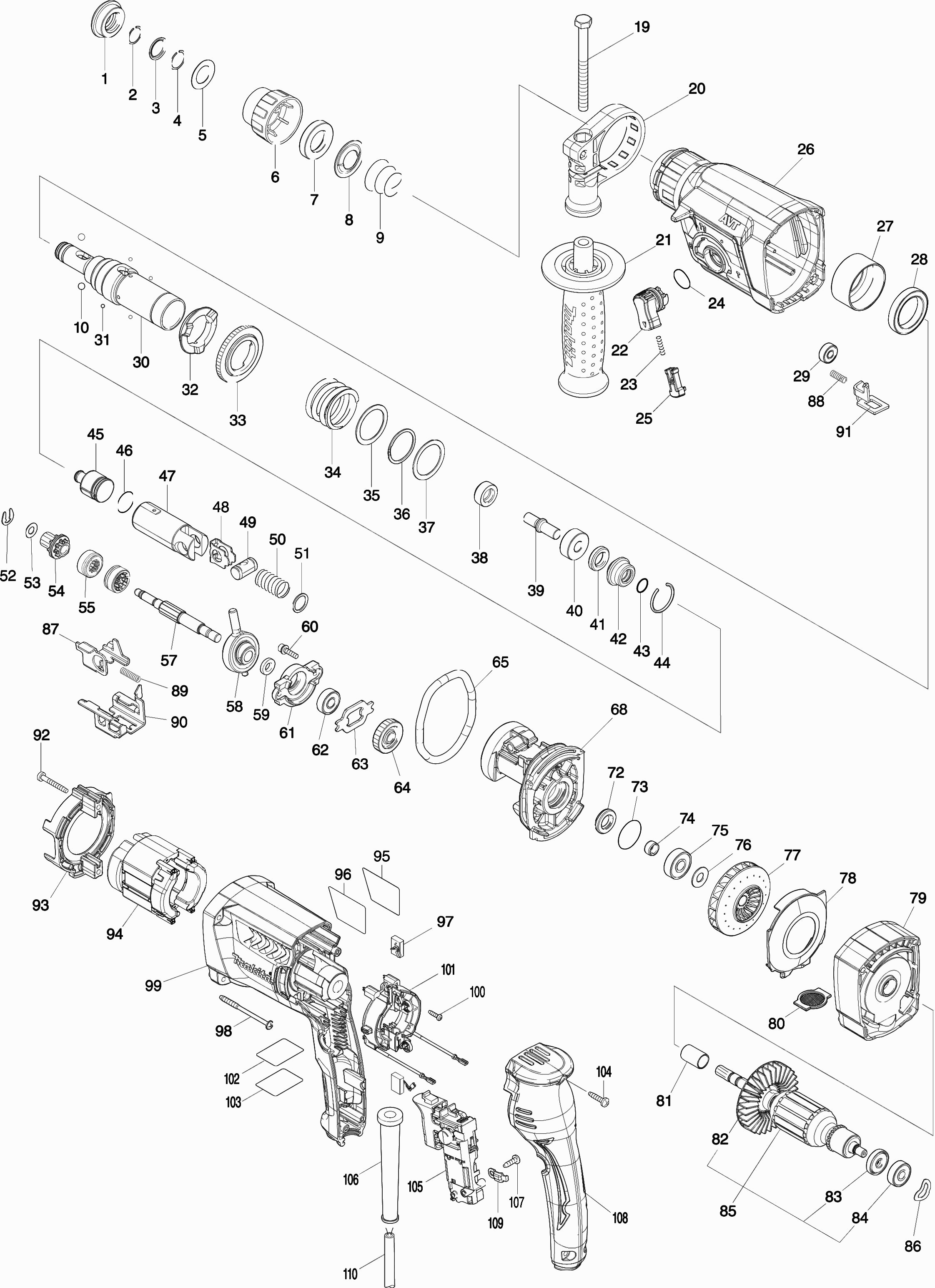Here you will find all available parts and drawings of the 'Makita HR2650'. From here you can order all desired parts directly. Many parts must be ordered from the manufacturer, depending on the brand, this takes one to four weeks. All the information we have is on our website, we cannot advise you on what you need, for that you will need to return the machine for repair. Please note the following when ordering: