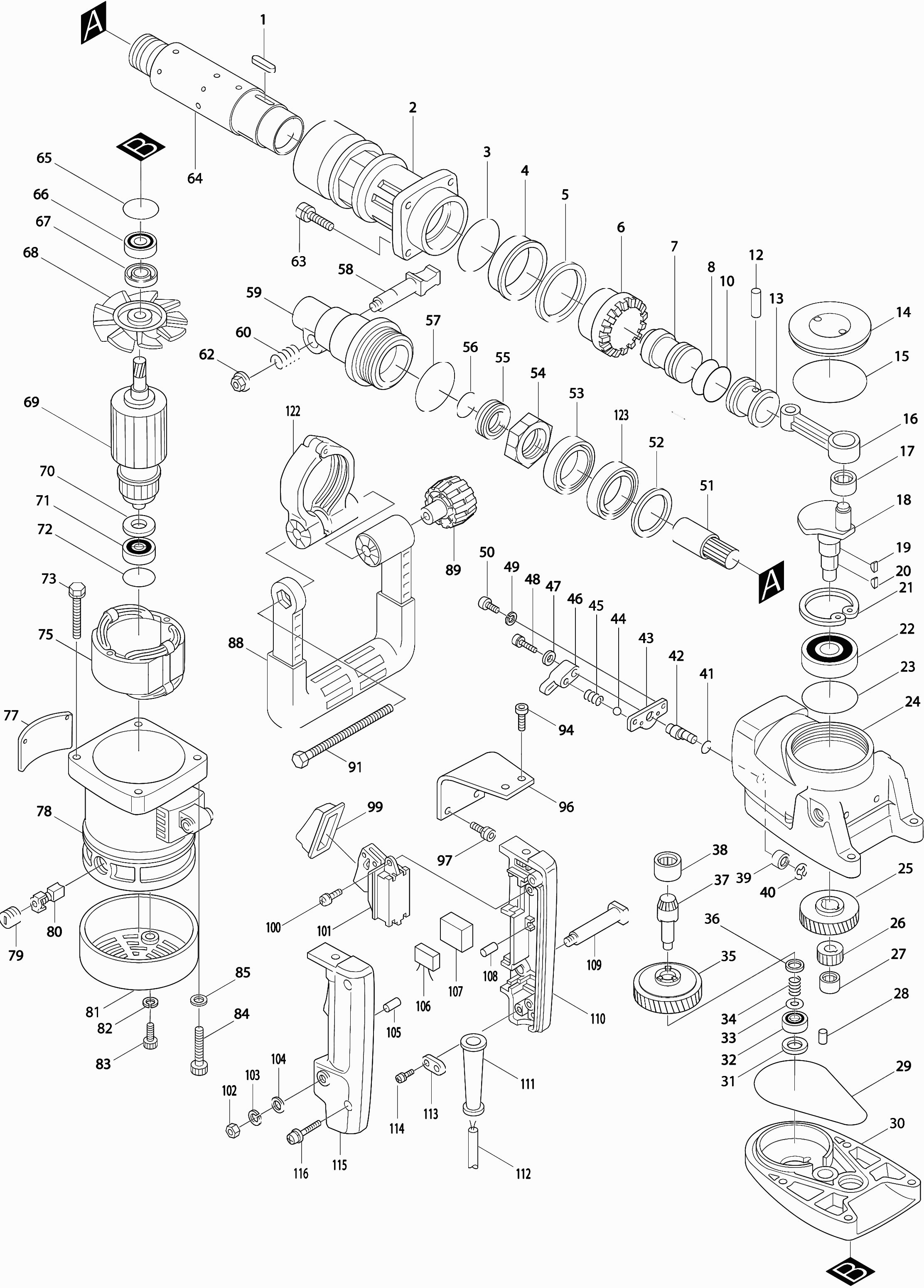Here you will find all available parts and drawings of the 'Makita HR5000'. From here you can order all desired parts directly. Many parts must be ordered from the manufacturer, depending on the brand, this takes one to four weeks. All the information we have is on our website, we cannot advise you on what you need, for that you will need to return the machine for repair. Please note the following when ordering:
