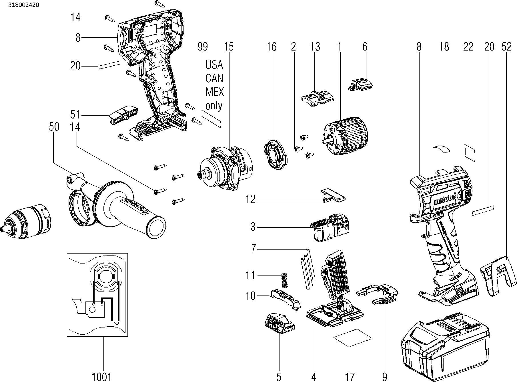 Here you will find all available parts and drawings of the 'Metabo 02197000 ( BS18LTXBLQUICK )'. From here you can order all desired parts directly. Many parts must be ordered from the manufacturer, depending on the brand, this takes one to four weeks. All the information we have is on our website, we cannot advise you on what you need, for that you will need to return the machine for repair. Please note the following when ordering: