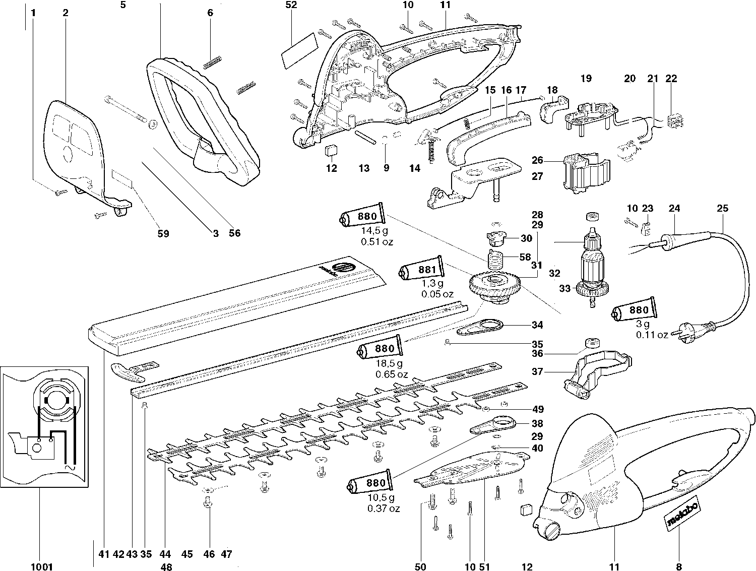Here you will find all available parts and drawings of the 'Metabo 08355000 ( HS8355S )'. From here you can order all desired parts directly. Many parts must be ordered from the manufacturer, depending on the brand, this takes one to four weeks. All the information we have is on our website, we cannot advise you on what you need, for that you will need to return the machine for repair. Please note the following when ordering: