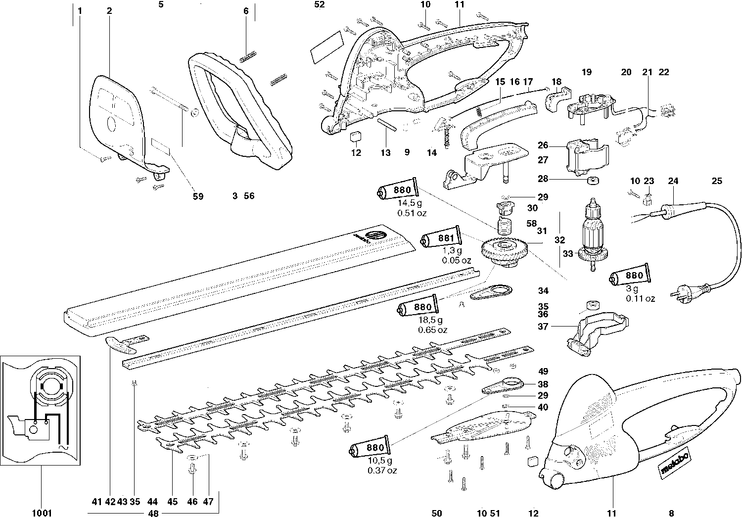 Here you will find all available parts and drawings of the 'Metabo 08365000 ( HS8365S )'. From here you can order all desired parts directly. Many parts must be ordered from the manufacturer, depending on the brand, this takes one to four weeks. All the information we have is on our website, we cannot advise you on what you need, for that you will need to return the machine for repair. Please note the following when ordering: