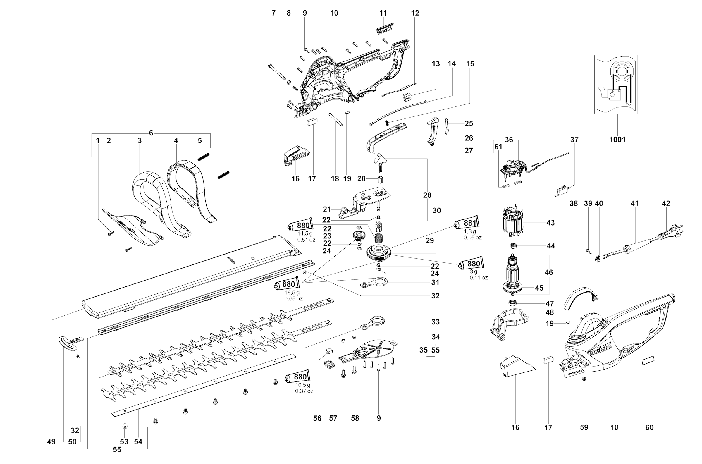 Here you will find all available parts and drawings of the 'Metabo 08865000 ( HS8865 )'. From here you can order all desired parts directly. Many parts must be ordered from the manufacturer, depending on the brand, this takes one to four weeks. All the information we have is on our website, we cannot advise you on what you need, for that you will need to return the machine for repair. Please note the following when ordering: