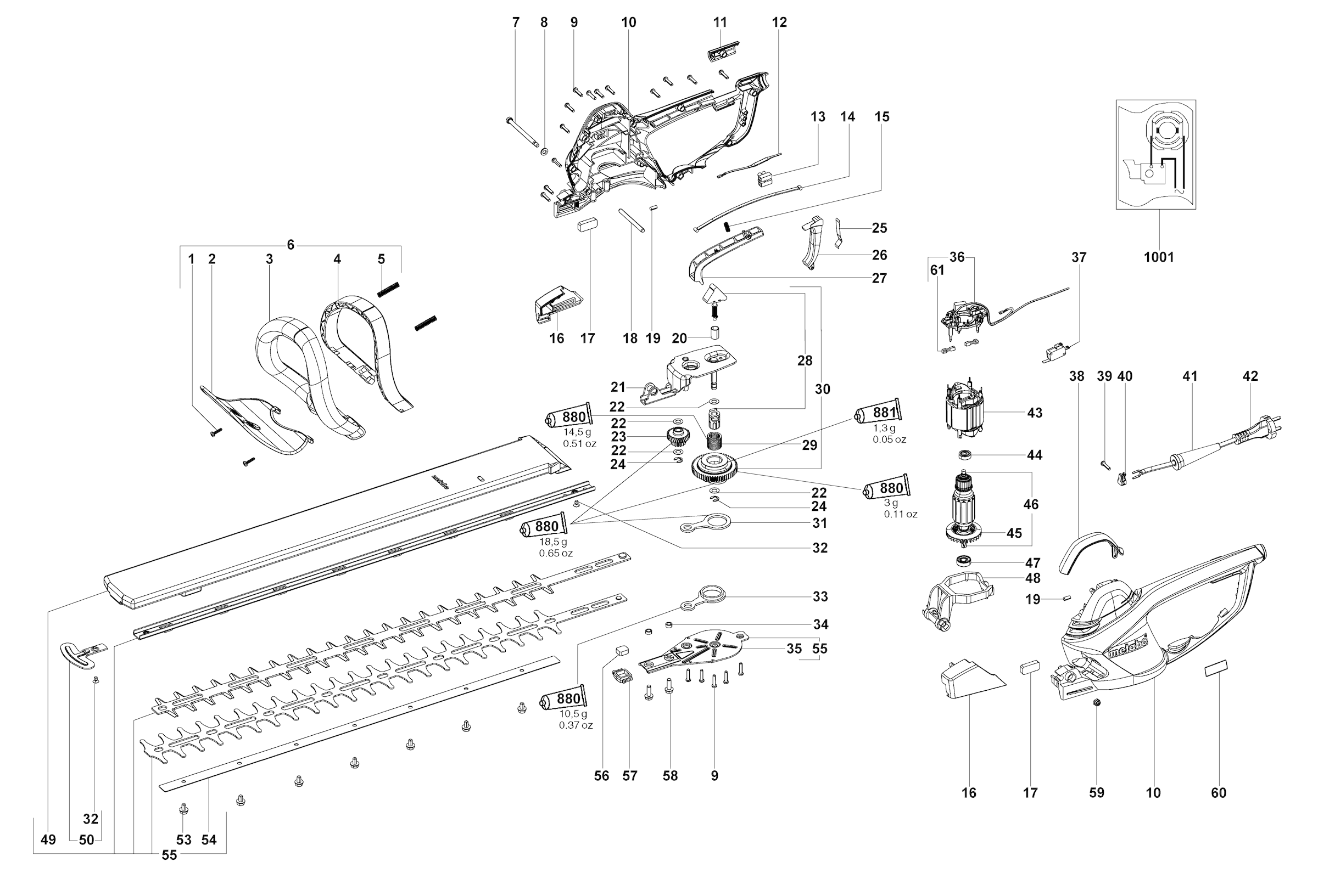Here you will find all available parts and drawings of the 'Metabo 08875000 ( HS8875 )'. From here you can order all desired parts directly. Many parts must be ordered from the manufacturer, depending on the brand, this takes one to four weeks. All the information we have is on our website, we cannot advise you on what you need, for that you will need to return the machine for repair. Please note the following when ordering:
