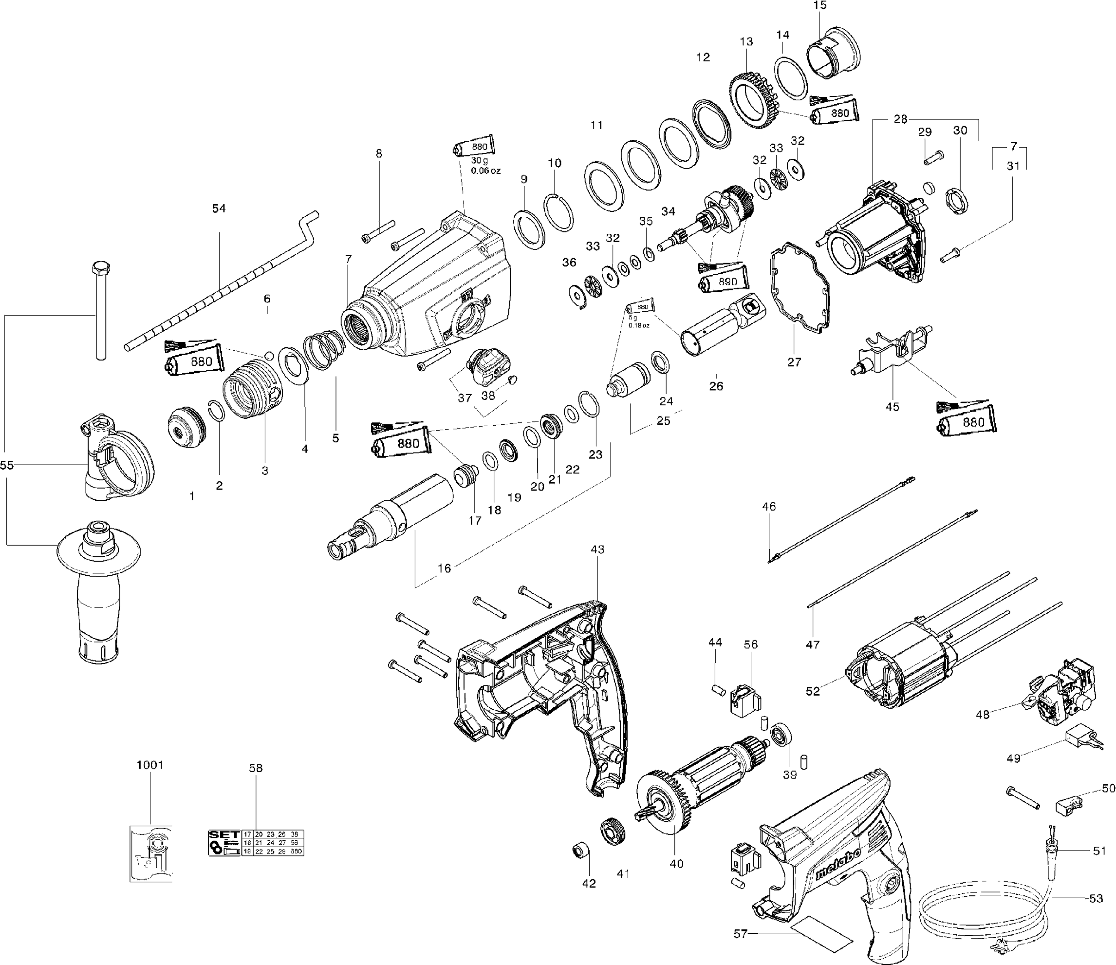 Here you will find all available parts and drawings of the 'Metabo 06154000 ( KHE2444 )'. From here you can order all desired parts directly. Many parts must be ordered from the manufacturer, depending on the brand, this takes one to four weeks. All the information we have is on our website, we cannot advise you on what you need, for that you will need to return the machine for repair. Please note the following when ordering: