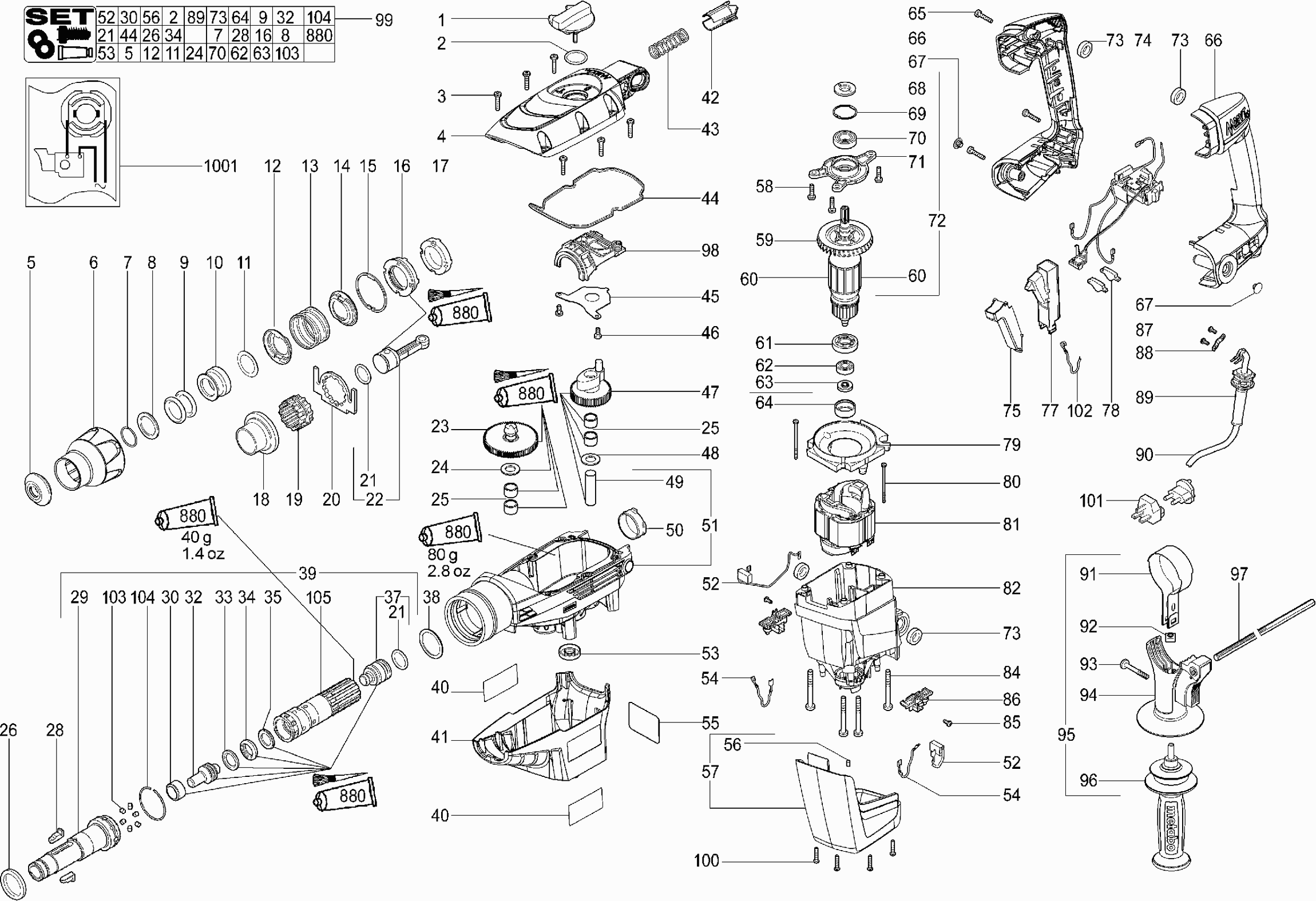 Here you will find all available parts and drawings of the 'Metabo 00340001 ( KHE56 )'. From here you can order all desired parts directly. Many parts must be ordered from the manufacturer, depending on the brand, this takes one to four weeks. All the information we have is on our website, we cannot advise you on what you need, for that you will need to return the machine for repair. Please note the following when ordering: