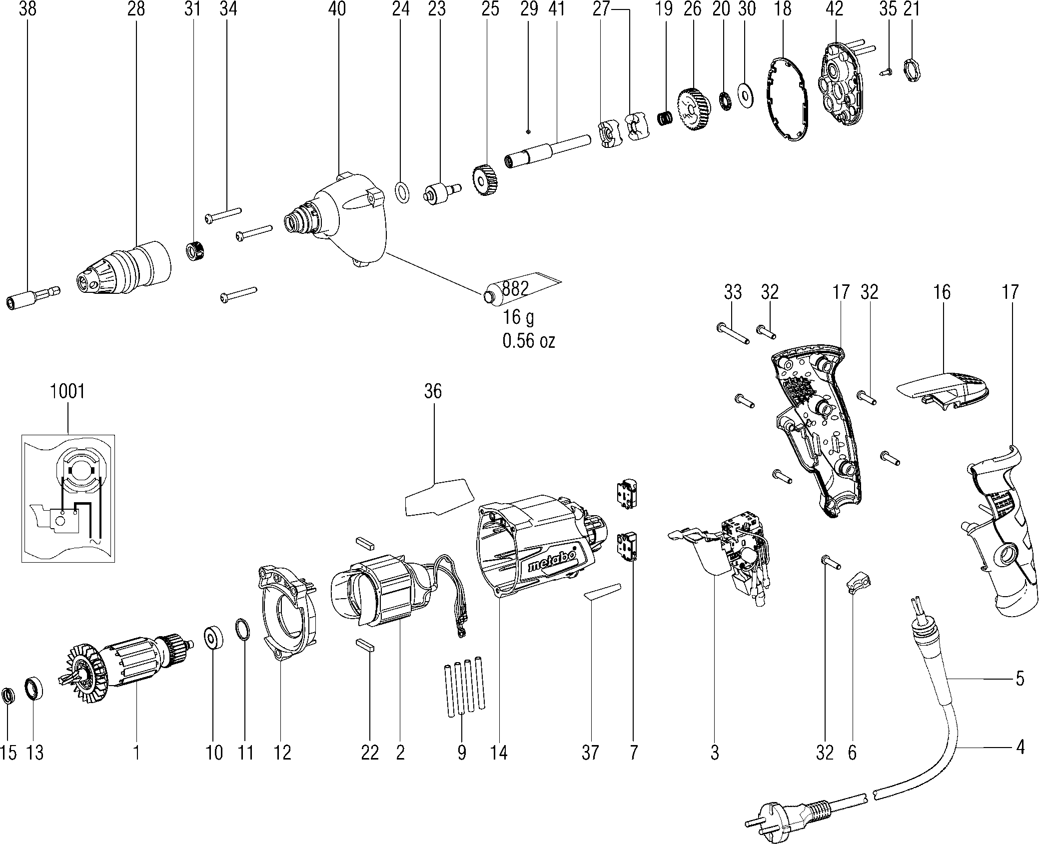 Here you will find all available parts and drawings of the 'Metabo 20044000 ( SE2500 )'. From here you can order all desired parts directly. Many parts must be ordered from the manufacturer, depending on the brand, this takes one to four weeks. All the information we have is on our website, we cannot advise you on what you need, for that you will need to return the machine for repair. Please note the following when ordering: