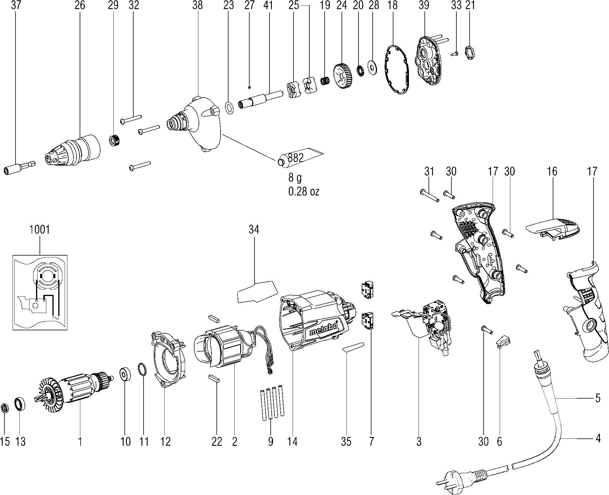 Here you will find all available parts and drawings of the 'Metabo 20045000 ( SE4000 )'. From here you can order all desired parts directly. Many parts must be ordered from the manufacturer, depending on the brand, this takes one to four weeks. All the information we have is on our website, we cannot advise you on what you need, for that you will need to return the machine for repair. Please note the following when ordering: