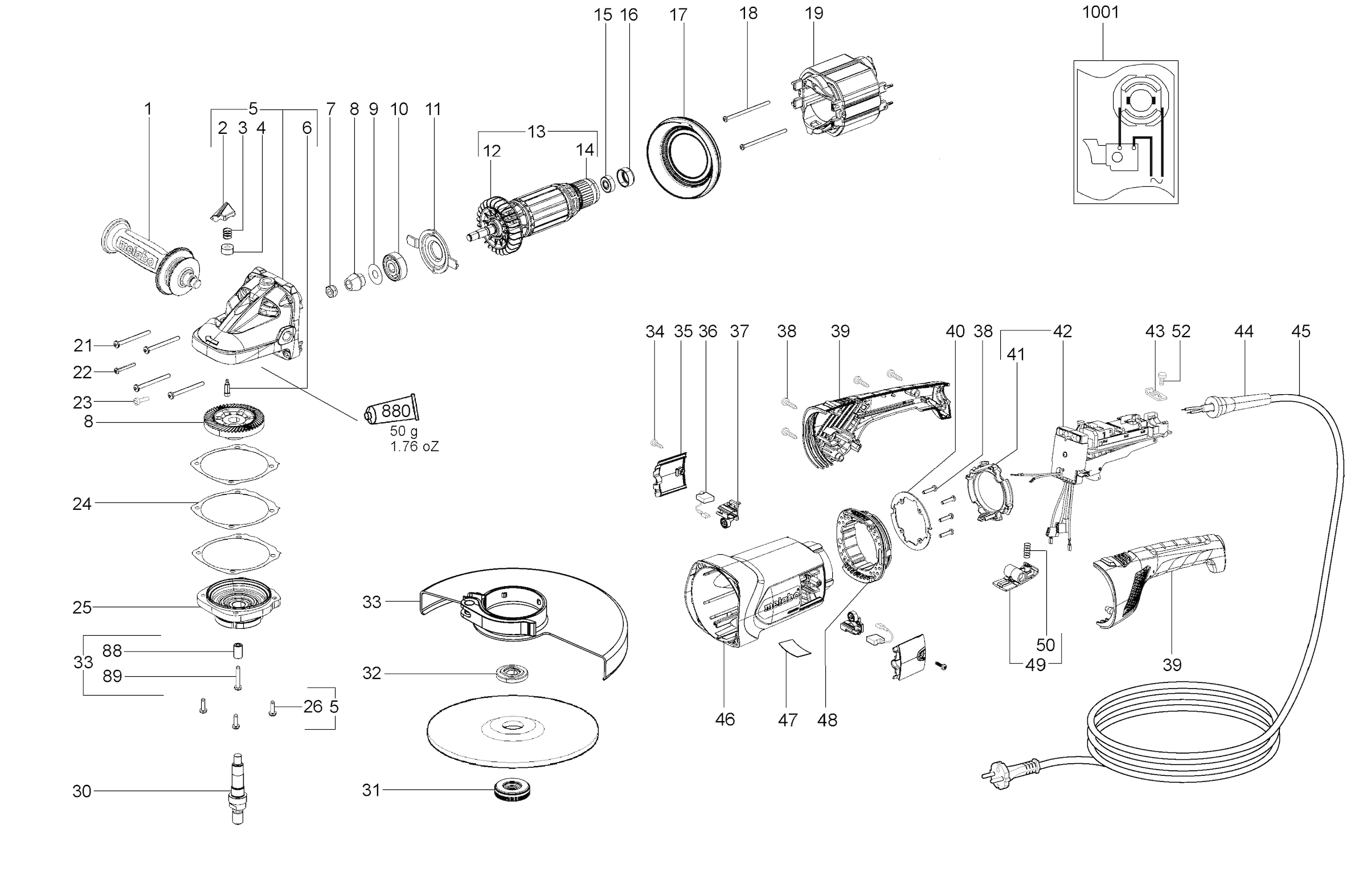 Here you will find all available parts and drawings of the 'Metabo 06460001 ( WX22-230QUICK )'. From here you can order all desired parts directly. Many parts must be ordered from the manufacturer, depending on the brand, this takes one to four weeks. All the information we have is on our website, we cannot advise you on what you need, for that you will need to return the machine for repair. Please note the following when ordering: