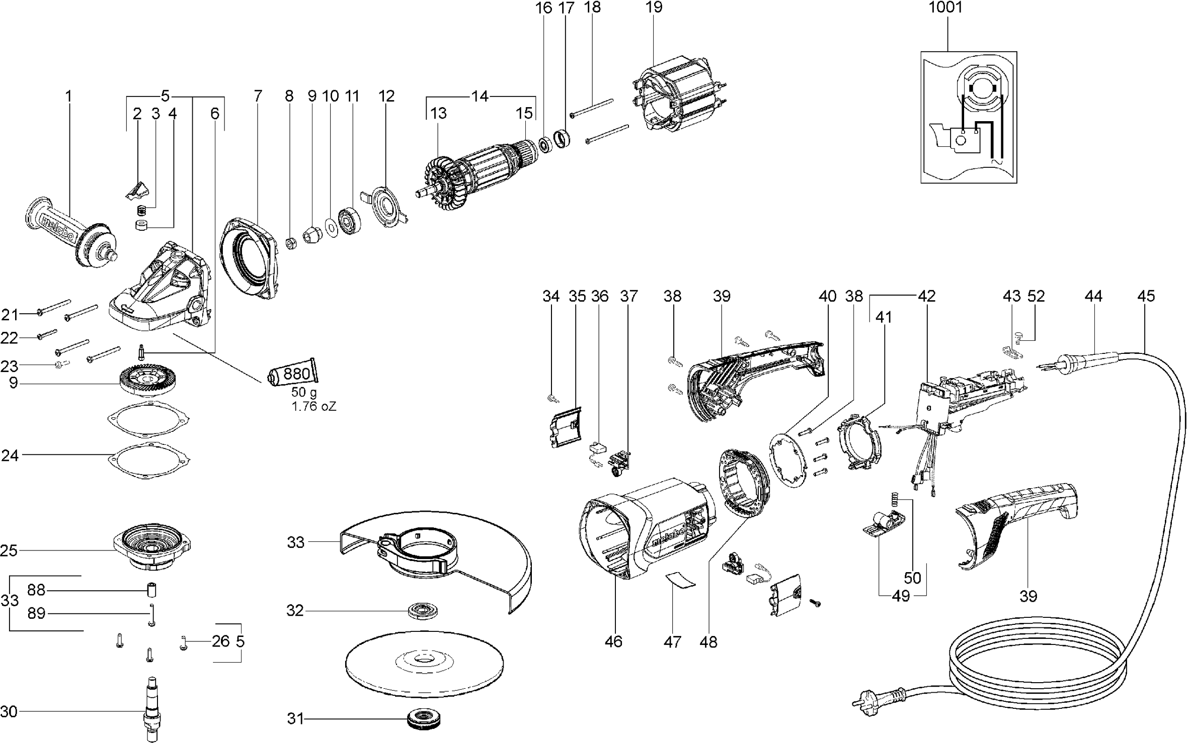 Here you will find all available parts and drawings of the 'Metabo 06454001 ( WX26-230QUICK )'. From here you can order all desired parts directly. Many parts must be ordered from the manufacturer, depending on the brand, this takes one to four weeks. All the information we have is on our website, we cannot advise you on what you need, for that you will need to return the machine for repair. Please note the following when ordering: