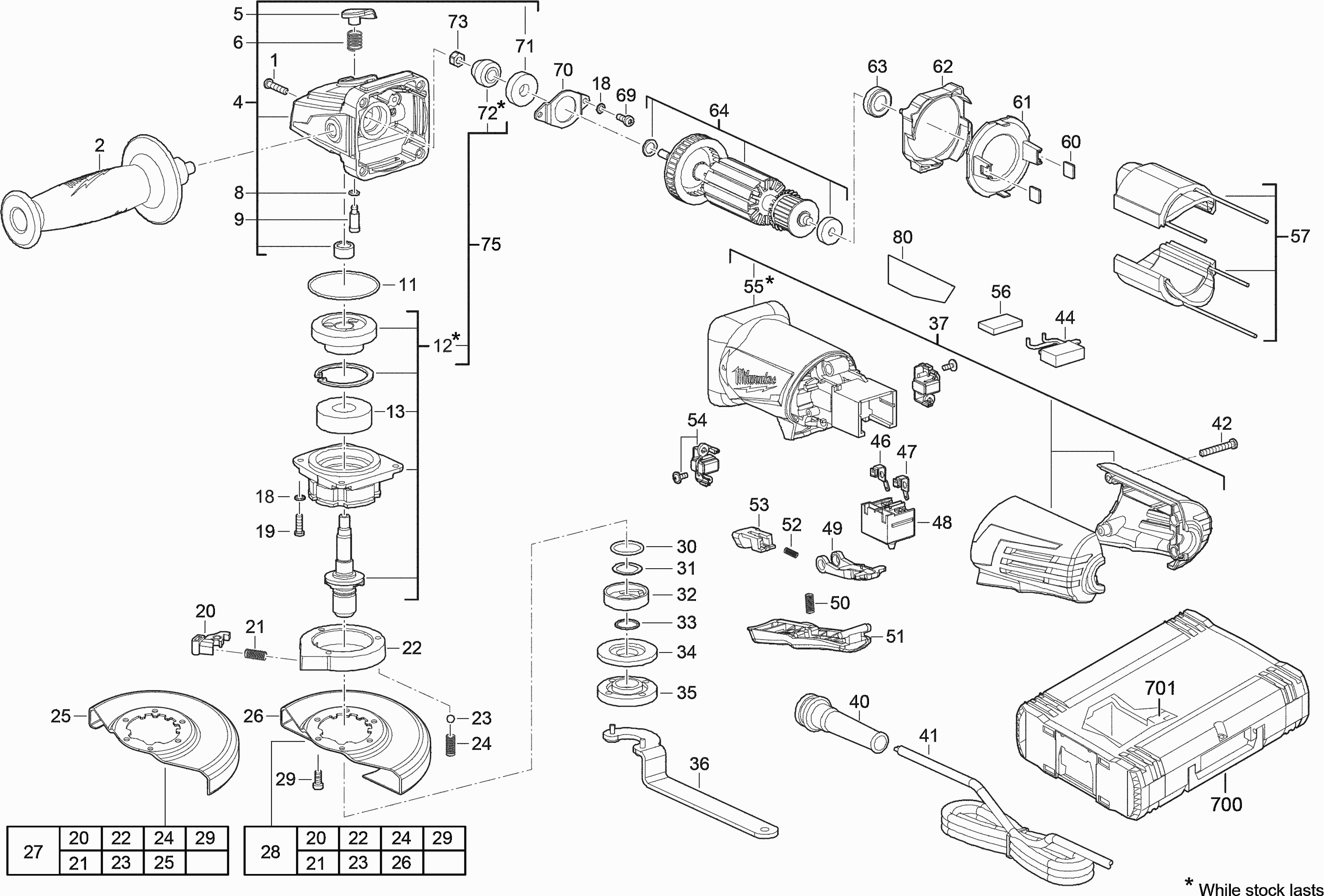 Here you will find all available parts and drawings of the 'Milwaukee 4000428141 ( AG12-115X120V )'. From here you can order all desired parts directly. Many parts must be ordered from the manufacturer, depending on the brand, this takes one to four weeks. All the information we have is on our website, we cannot advise you on what you need, for that you will need to return the machine for repair. Please note the following when ordering: