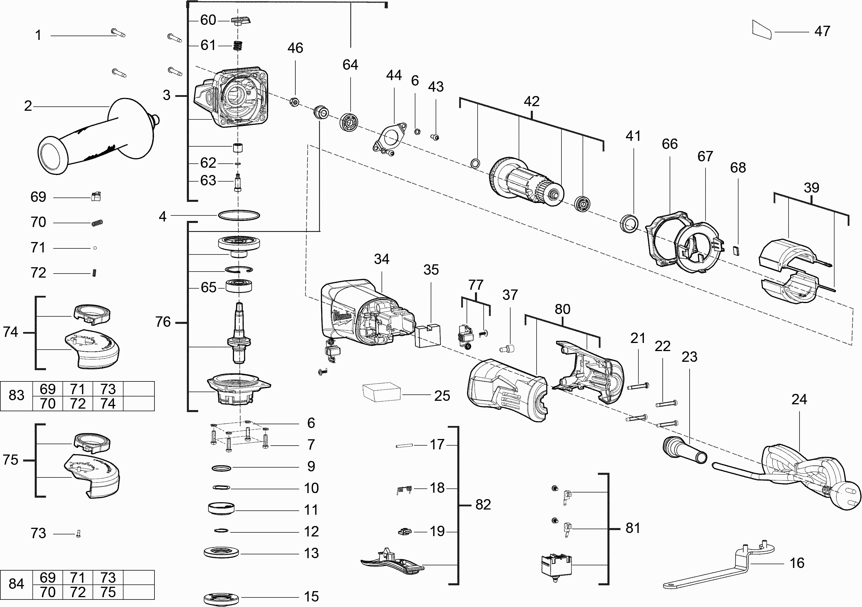 Here you will find all available parts and drawings of the 'Milwaukee 4000458015 ( AG13-125XSPDIN2 )'. From here you can order all desired parts directly. Many parts must be ordered from the manufacturer, depending on the brand, this takes one to four weeks. All the information we have is on our website, we cannot advise you on what you need, for that you will need to return the machine for repair. Please note the following when ordering: