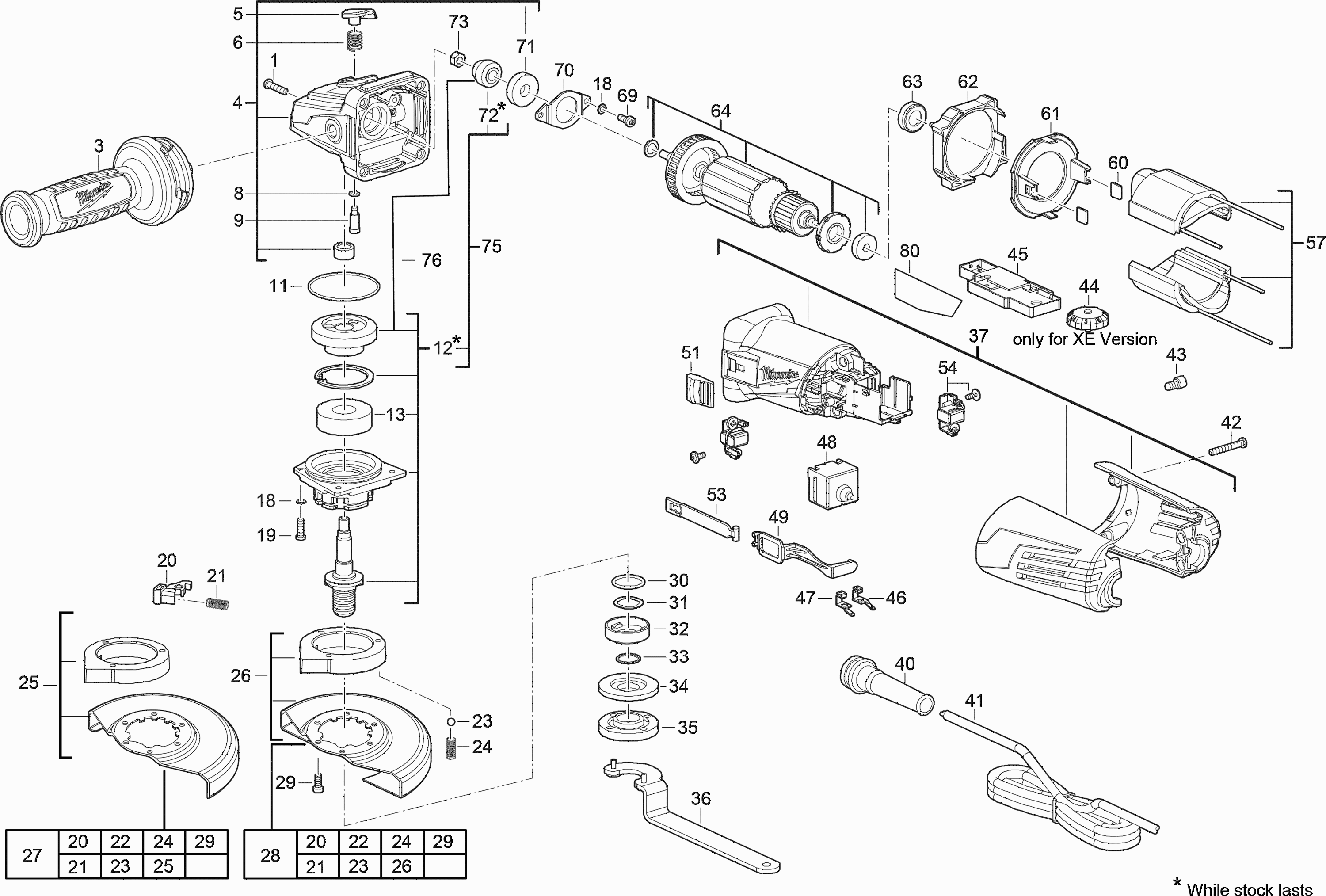 Here you will find all available parts and drawings of the 'Milwaukee 4000428121 ( AGV15-125XC )'. From here you can order all desired parts directly. Many parts must be ordered from the manufacturer, depending on the brand, this takes one to four weeks. All the information we have is on our website, we cannot advise you on what you need, for that you will need to return the machine for repair. Please note the following when ordering: