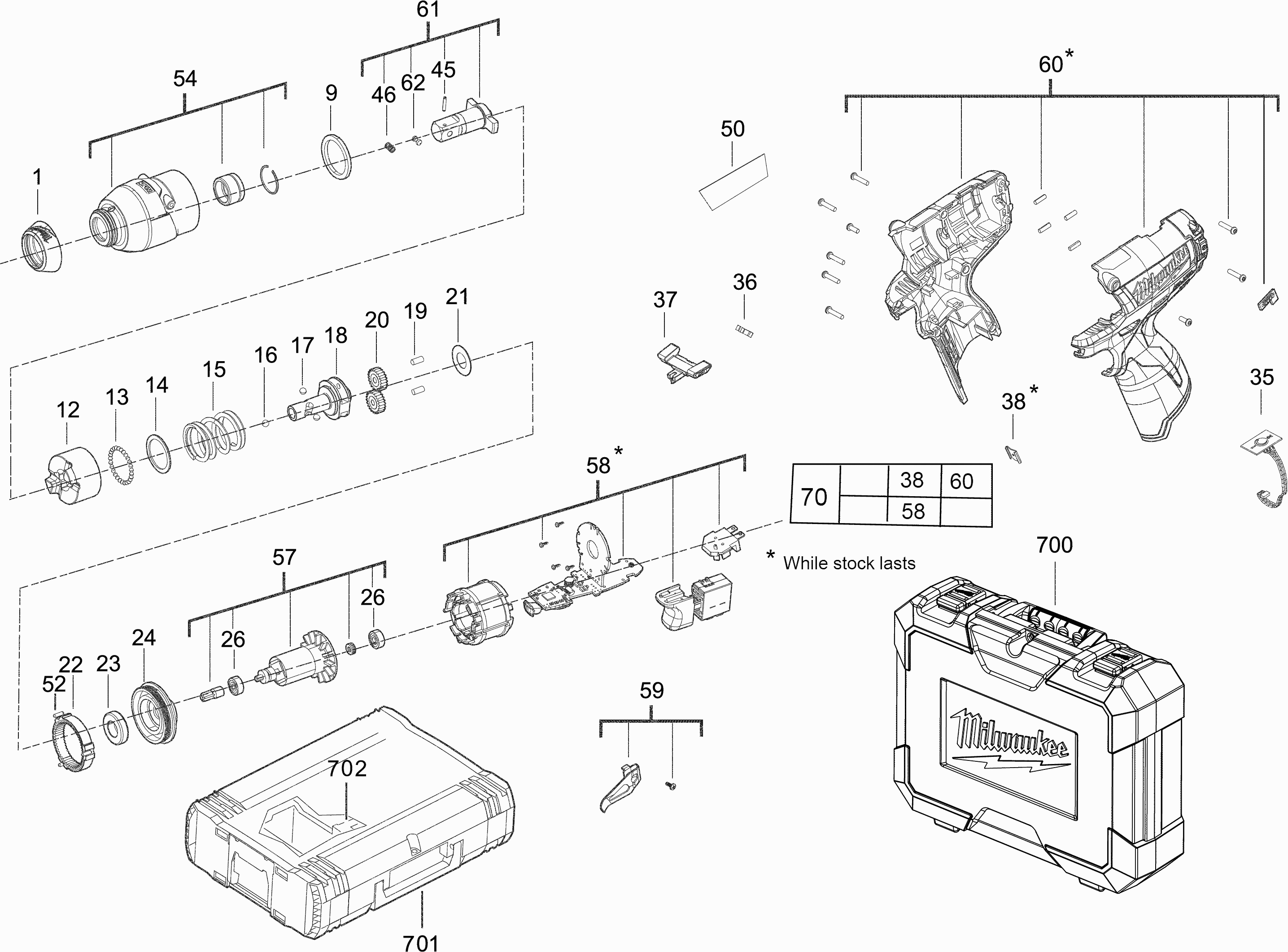 Here you will find all available parts and drawings of the 'Milwaukee 4000447137 ( M12CIW12-0 )'. From here you can order all desired parts directly. Many parts must be ordered from the manufacturer, depending on the brand, this takes one to four weeks. All the information we have is on our website, we cannot advise you on what you need, for that you will need to return the machine for repair. Please note the following when ordering: