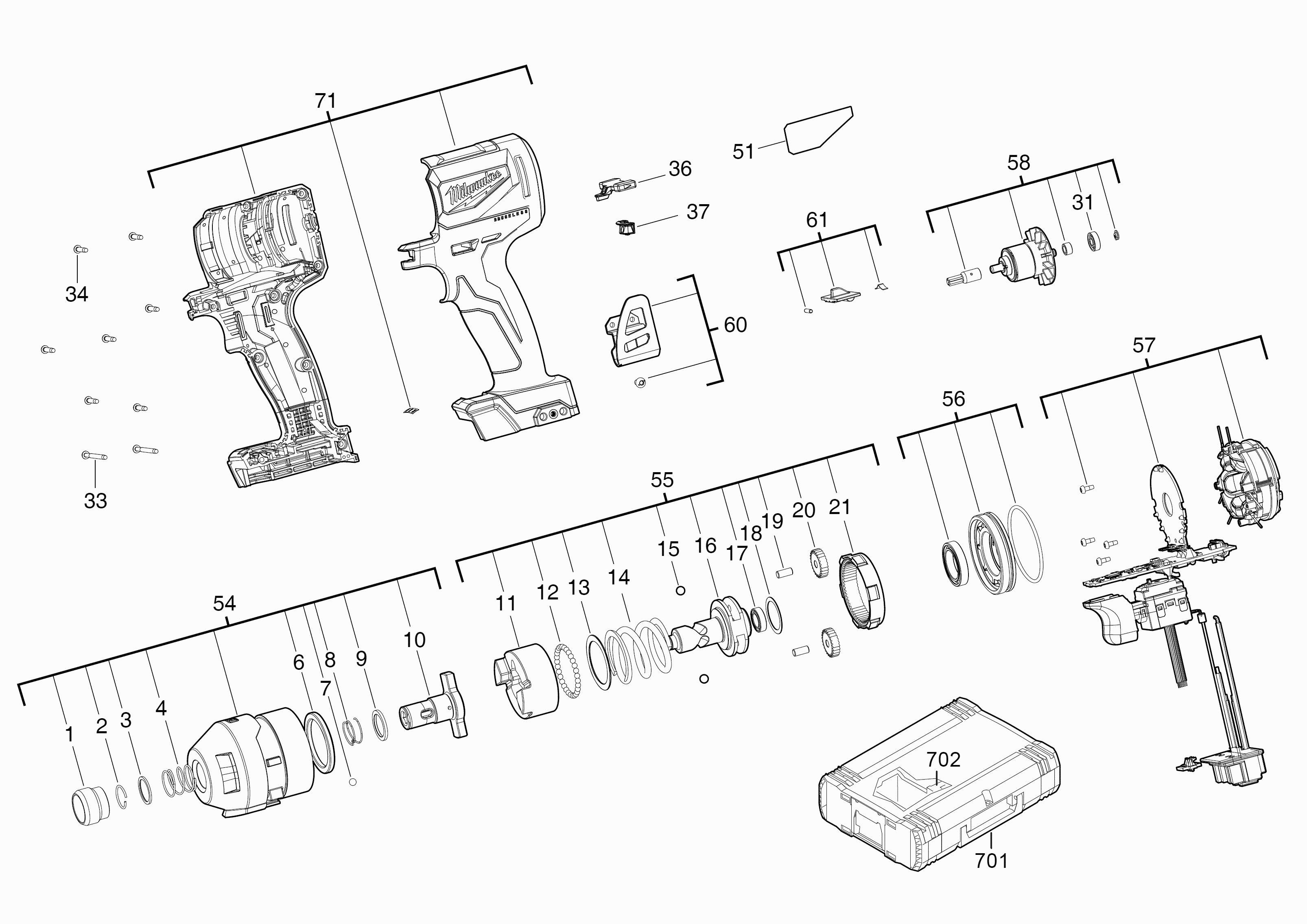 Spare parts list of model Milwaukee 4000467996 ( M18BLID2-0X )