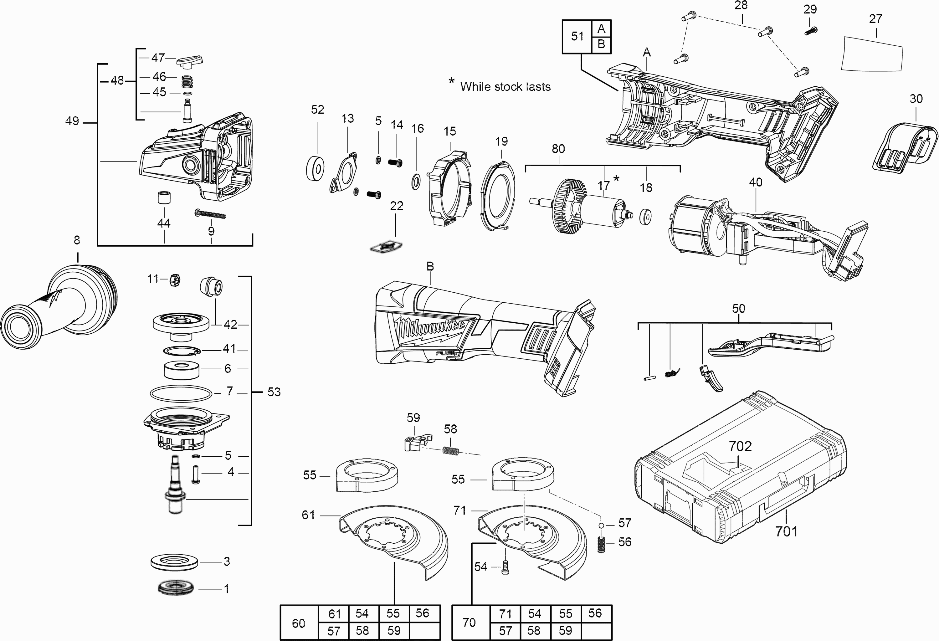 Here you will find all available parts and drawings of the 'Milwaukee 4000458524 ( M18CAG125XPDB-0 )'. From here you can order all desired parts directly. Many parts must be ordered from the manufacturer, depending on the brand, this takes one to four weeks. All the information we have is on our website, we cannot advise you on what you need, for that you will need to return the machine for repair. Please note the following when ordering: