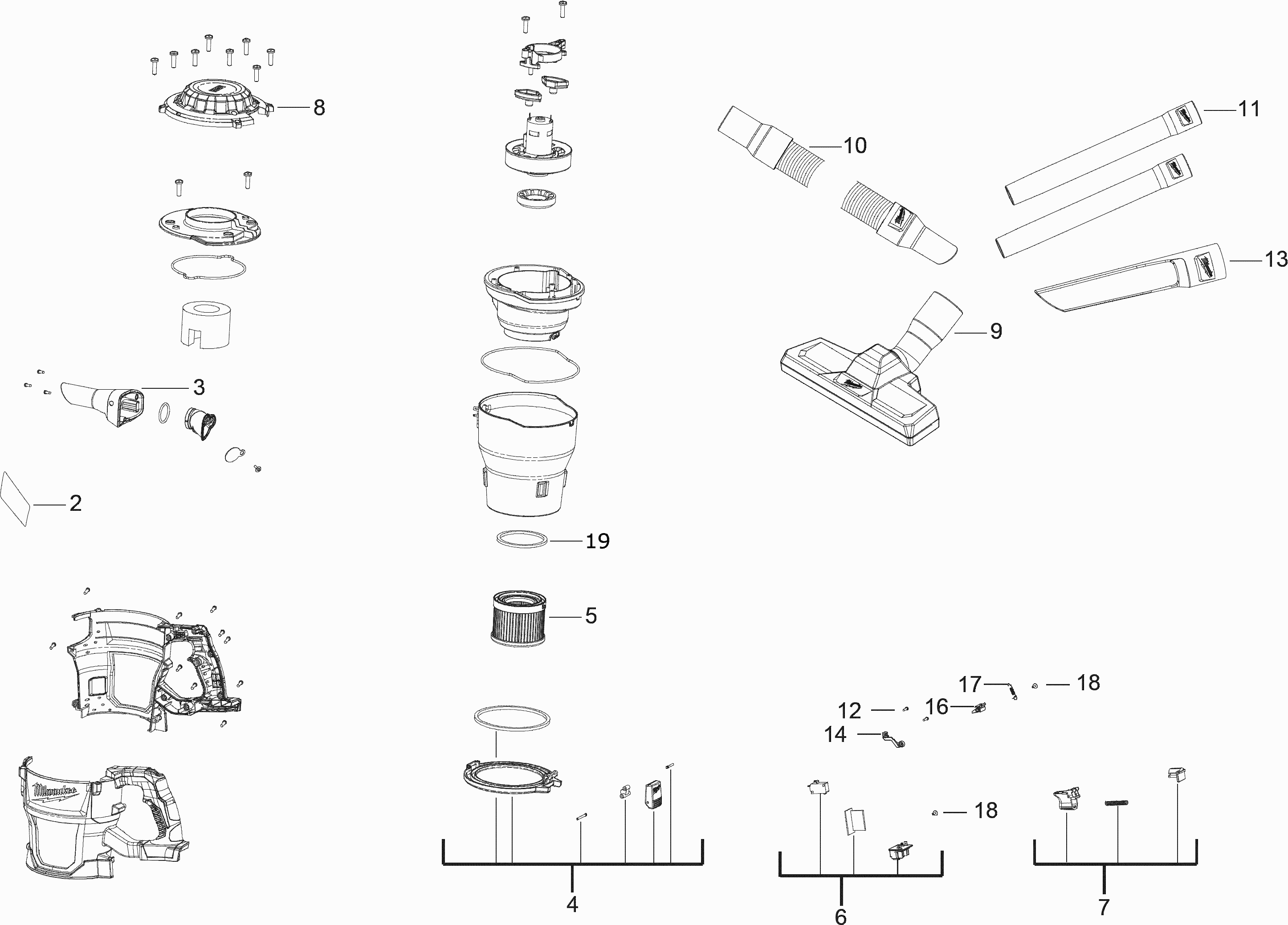 Here you will find all available parts and drawings of the 'Milwaukee 4000458288 ( M18CV-0 )'. From here you can order all desired parts directly. Many parts must be ordered from the manufacturer, depending on the brand, this takes one to four weeks. All the information we have is on our website, we cannot advise you on what you need, for that you will need to return the machine for repair. Please note the following when ordering: