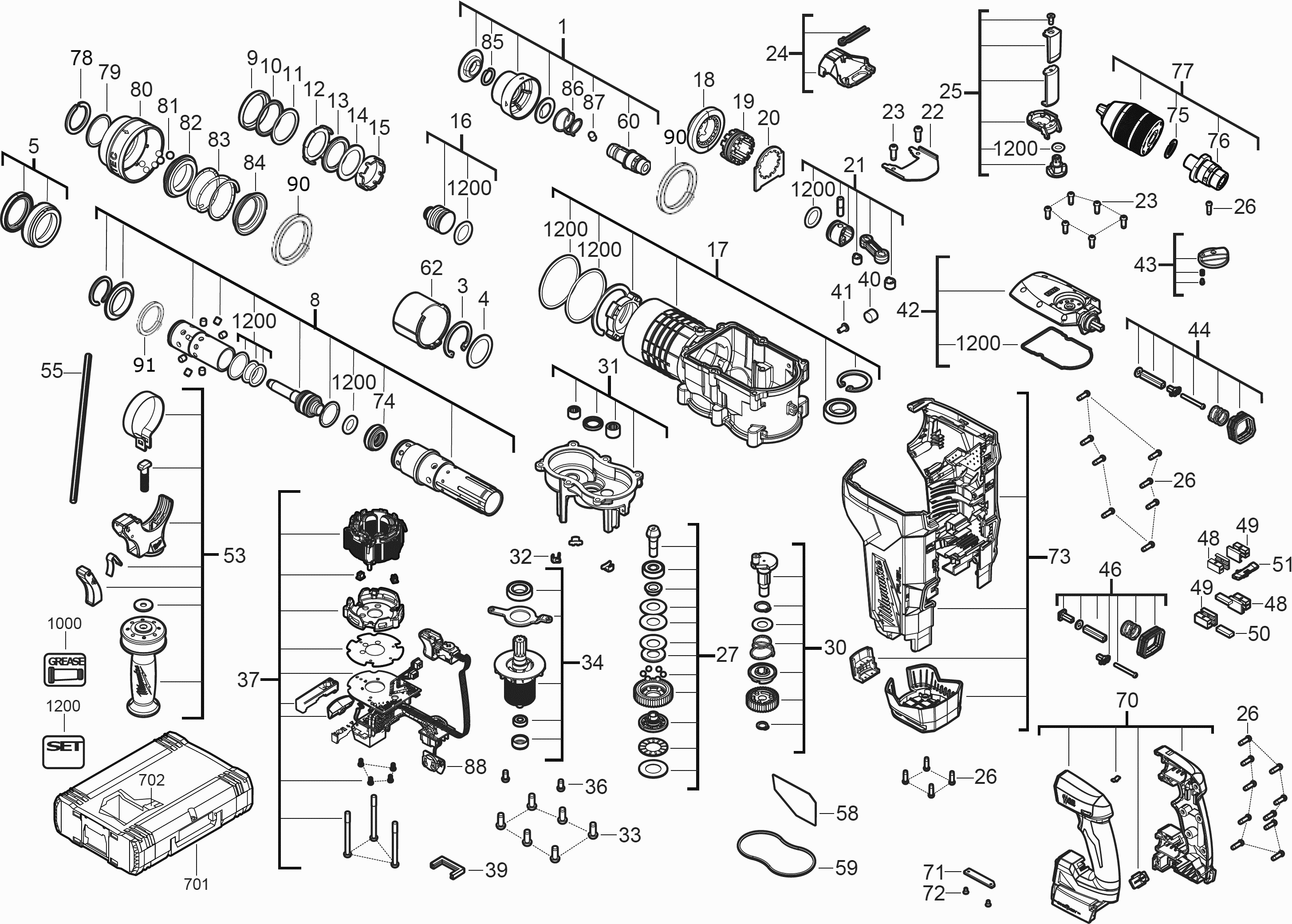 Spare parts list of model Milwaukee 4000477945 ( M18ONEFHPX-0 )